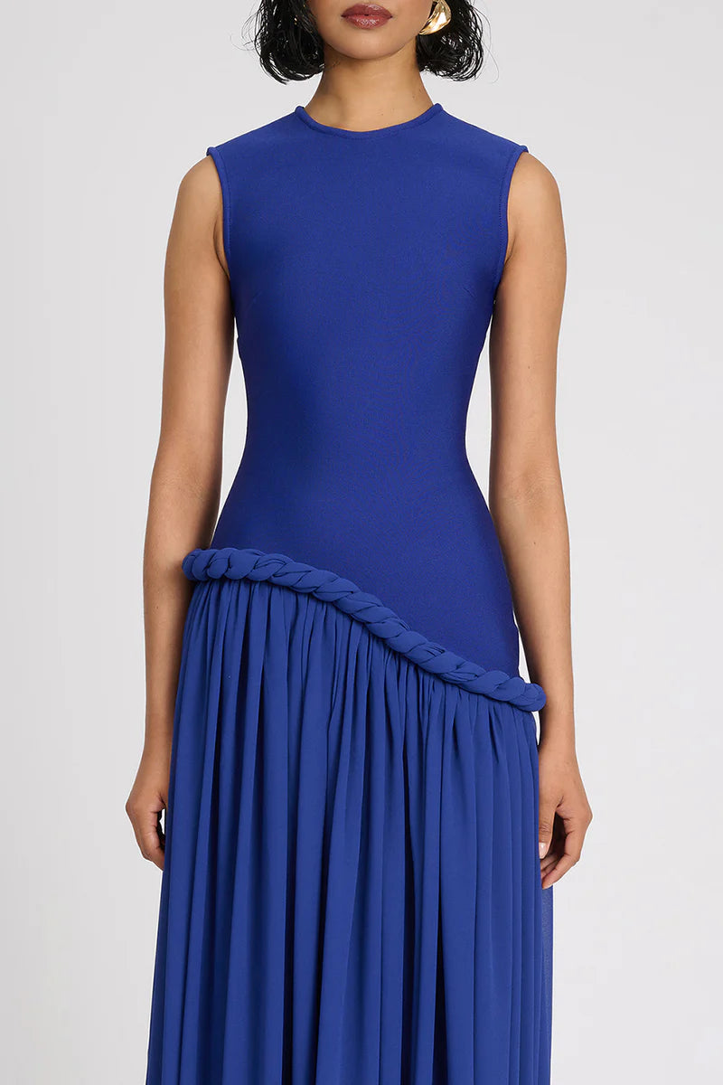 The Spencer Gown is a striking fusion of sculptural structure and fluid elegance. Designed with a high neckline and sleeveless silhouette, this full-length gown features a contoured bandage bodice that sculpts and supports the form. Soft chiffon plait detailing adds textural contrast before flowing into a full chiffon skirt with a dramatic high split. Rendered in a rich royal blue, the Spencer Gown is designed to command attention at formal events, black-tie occasions, and evening celebrations.