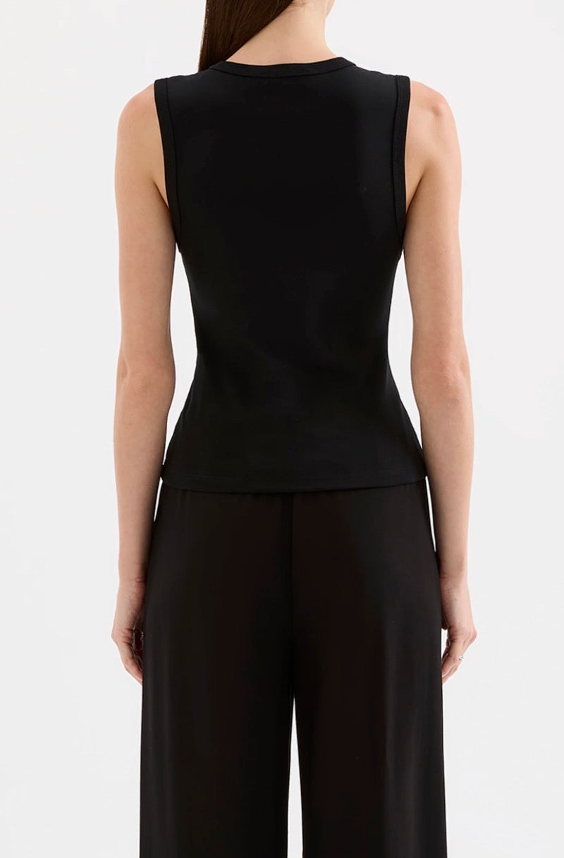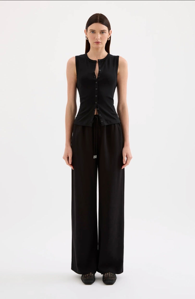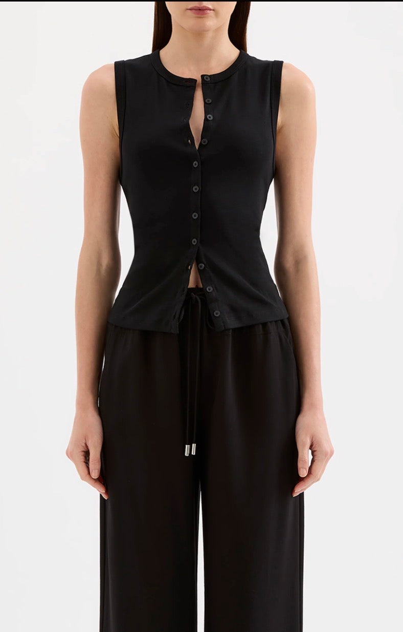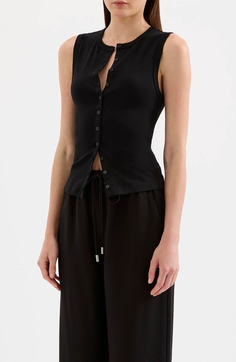 The Kenna Top is crafted from 100% cotton with a soft, stretch fabrication. This top has a sleeveless top silhouette, crew neckline, button front opening and finishes above the hips.