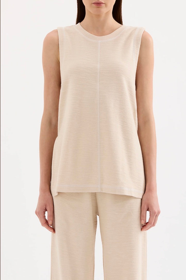 The Sutton Tunic is made from a textured cotton/linen blend fabrication that has a breathable hand feel. This sleeveless tunic has a boxy fit and features a crew neckline, side seam slits and contrast white stitching detail.