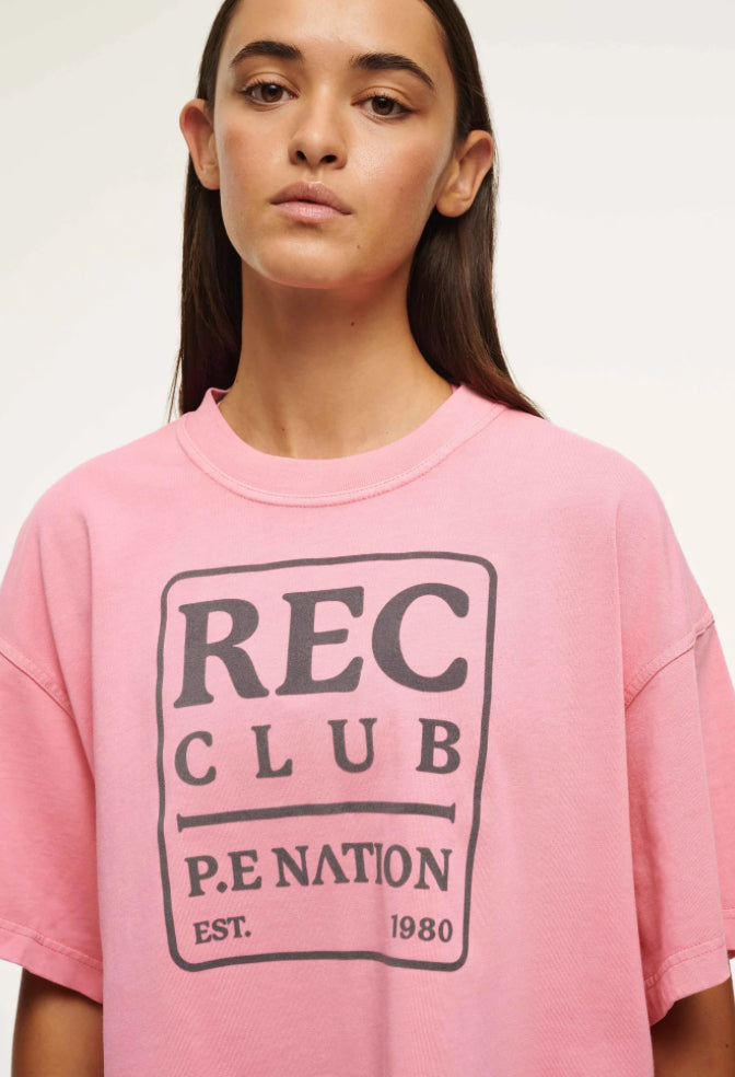 The Rally Tee in Pink Lemonade comes as part of our REC CLUB Collection. Made from a lush heavy-weight 100% cotton jersey, this vintage garment dyed tee features a relaxed boxy silhouette and P.E Nation graphic prints. The ideal lounging piece, style yours with trackpants or bike shorts.