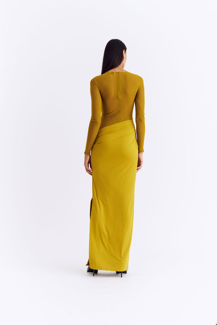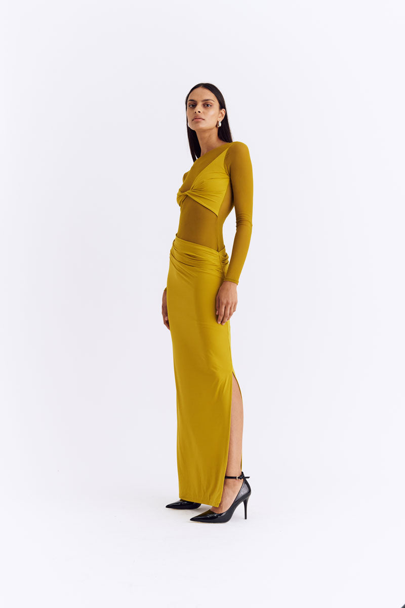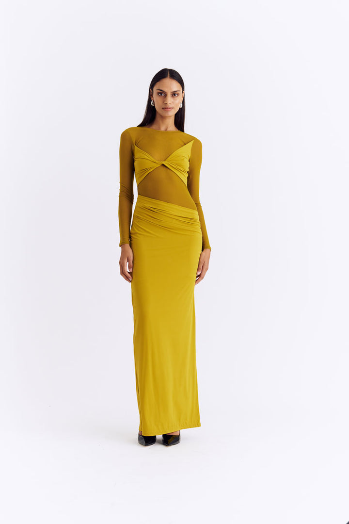 THE AUGUSTE LONG-SLEEVE MESH JERSEY MAXI IN CITRON IS CRAFTED FROM SOFT MESH AND JERSEY FEATURING A TWIST FRONT WITH ROUCHING DETAILS CREATING A CLASSIC AND FLATTERING FIT. PAIR THIS WITH YOUR FAVOURITE HEELS.