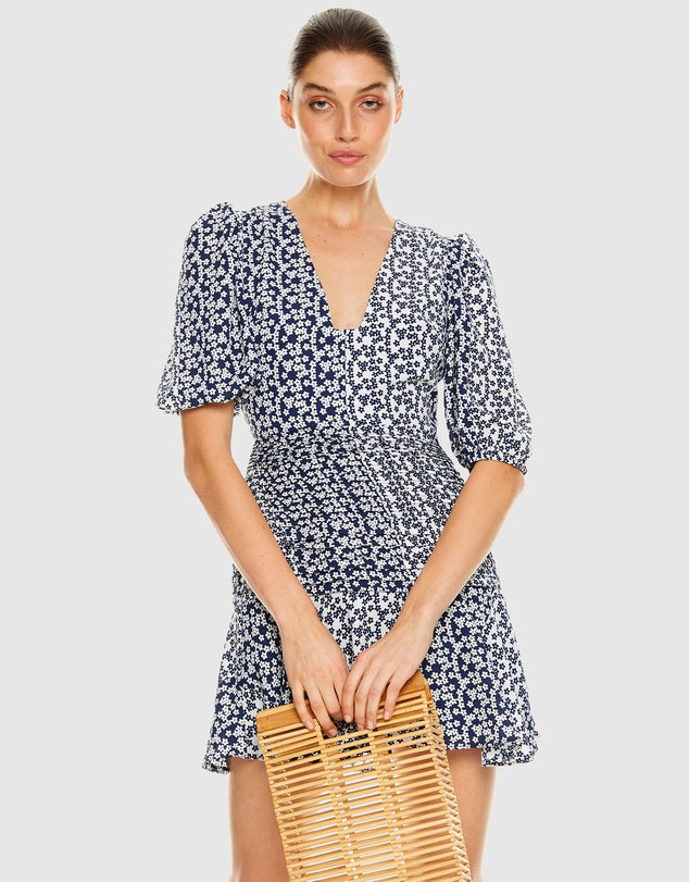 You’ll be hard to forget in this effortlessly chic mini. This flattering dress features a V-neckline, super cute puffed mid-length sleeves, all encompassed within a stylish print.