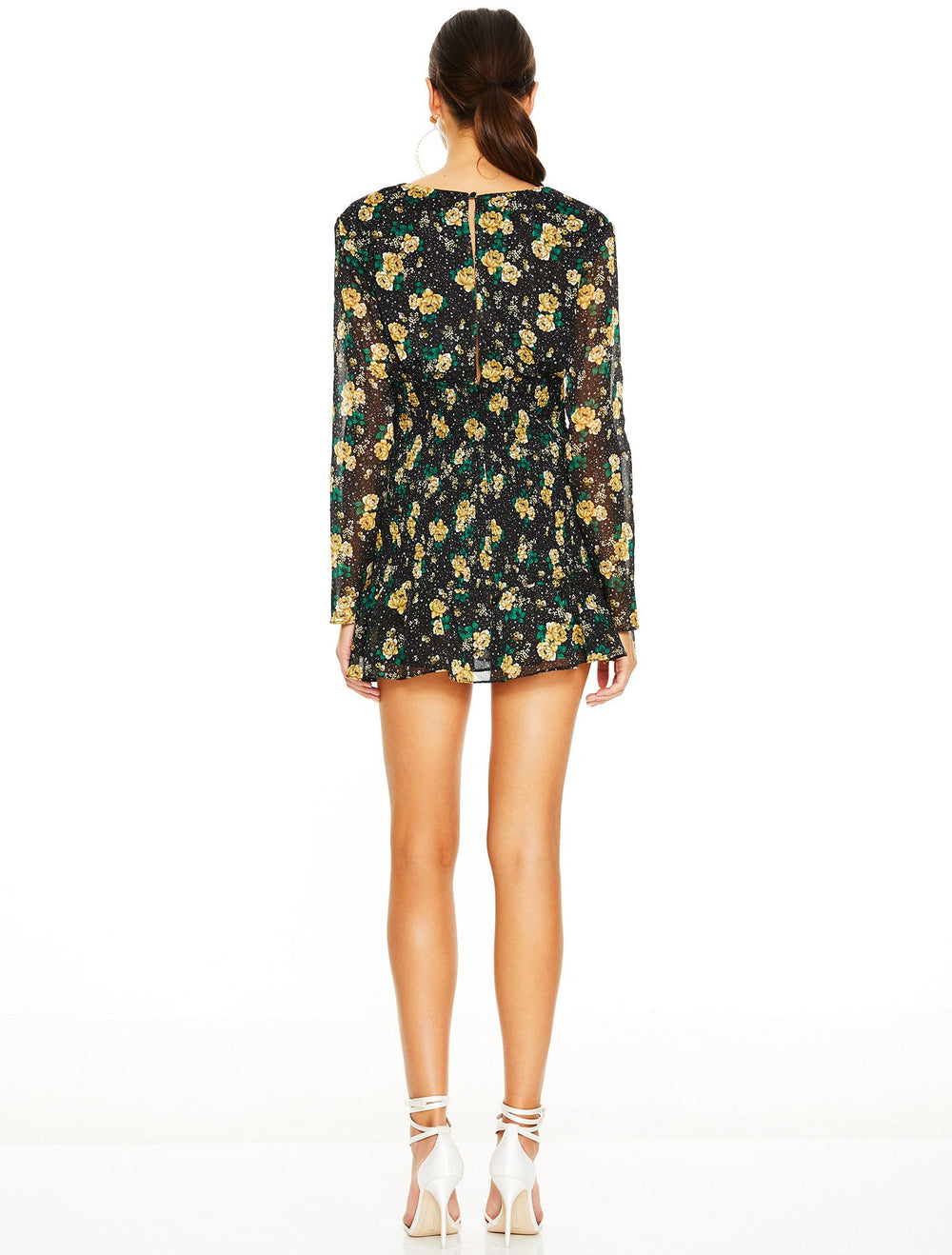 The perfect evening; a glass of prosecco under the stars. All that is needed is the Stardust mini. This dress features a V neckline, full length slim fit sleeves, pin tuck detailing, and a gathered skirt.