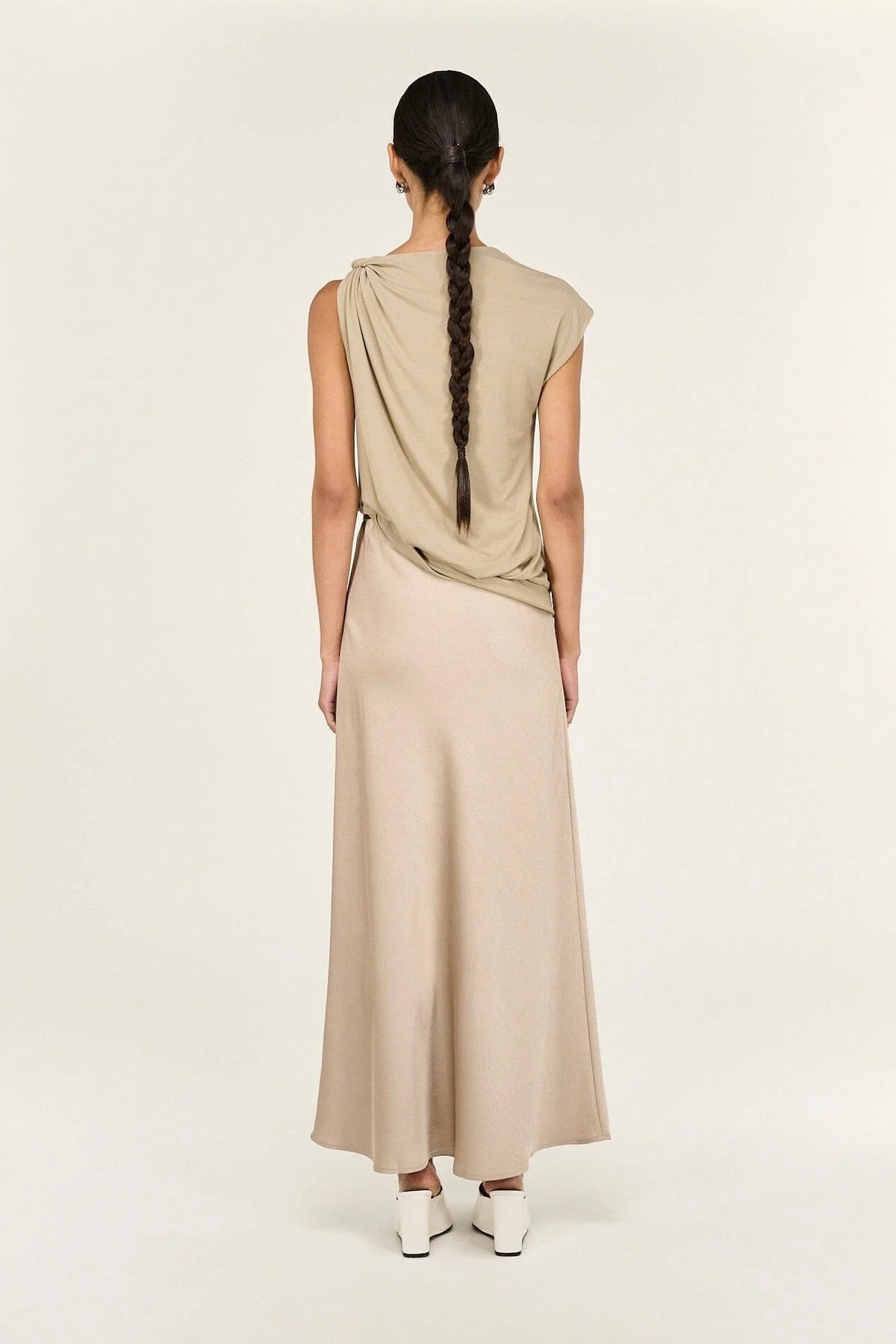 A refined essential, the Eva Moss Twist Asymmetric Tank is designed to drape effortlessly. Crafted in a soft stretch fabrication, it features an elegant high neckline and a statement twist detail at the shoulder that gathers through the body. The asymmetric hem adds subtle movement, creating a modern silhouette that feels both effortless and elevated. Style with tailored trousers or sleek denim for understated impact.
