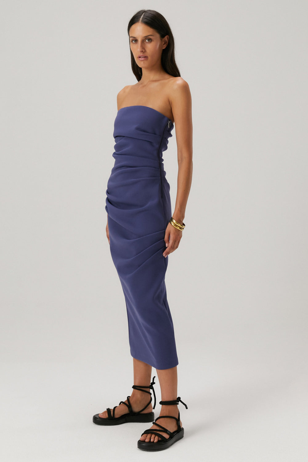 The Calandra is our modern take on the perfect 90’s strapless dress. Keep it elevated, but cool with strapless neckline, midi hemline and soft asymmetric tuck detail that flatters the figure.