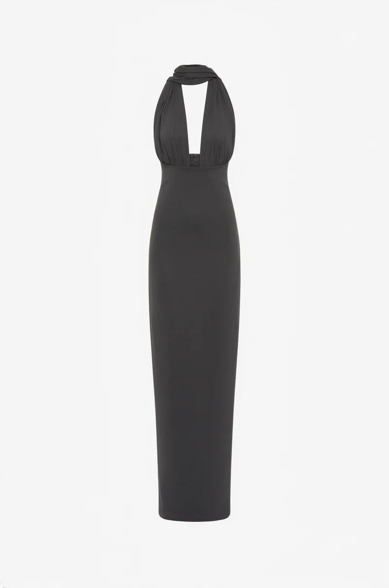 The Capezza Silk Dress pairs a lustrous silk upper with a fitted, light bonded crepe, midi length skirt. The plunging halter neckline features a versatile wrap design that can be draped in multiple ways.